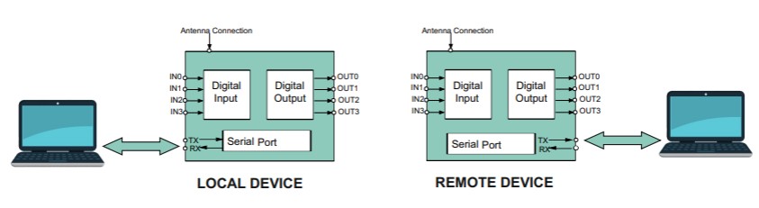 - Setting remote outputs:  With the command AT+OTA_OUTx=1, for example, you can set OUT1 of the remote device to high level, with no need for physical wiring.